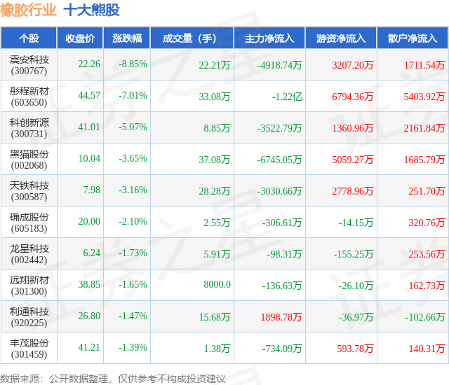 个股表现方面,橡胶行业当日领跌股为震安科技(300767),该股当日报收22.26,下跌8.85%,成交量22.21万,主力资金净流出4918.74万元。彤程新材(603650)以下跌7.01%紧随其后,该股当日成交量33.08万,主力资金净流出1.22亿元。除此之外,科创新源(300731)、黑猫股份(002068)、天铁科技(300587)均进入当日熊股之列。具体个股列表见下表:
