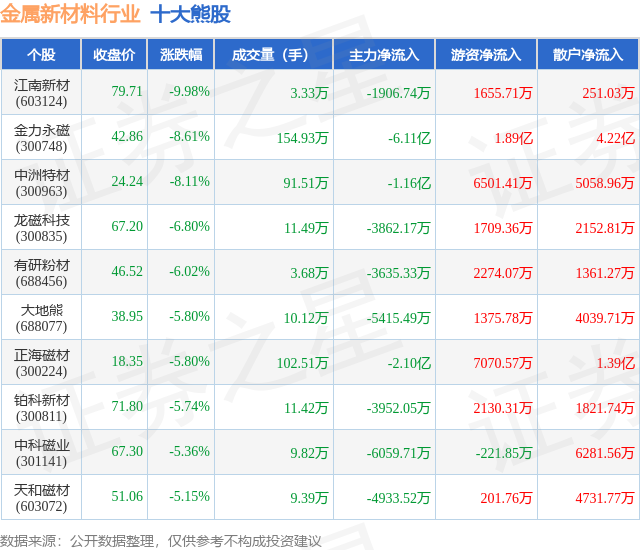 个股表现方面,金属新材料行业当日领跌股为江南新材(603124),该股当日报收79.71,下跌9.98%,成交量3.33万,主力资金净流出1906.74万元。金力永磁(300748)以下跌8.61%紧随其后,该股当日成交量154.93万,主力资金净流出6.11亿元。除此之外,中洲特材(300963)、龙磁科技(300835)、有研粉材(688456)均进入当日熊股之列。具体个股列表见下表: