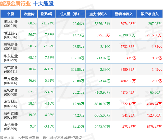 个股表现方面,能源金属行业当日领跌股为腾远钴业(301219),该股当日报收68.68,下跌11.24%,成交量22.64万,主力资金净流出5676.15万元。博迁新材(605376)以下跌7.88%紧随其后,该股当日成交量14.73万,主力资金净流入675.19万元。除此之外,寒锐钴业(300618)、华友钴业(603799)、盛屯矿业(600711)均进入当日熊股之列。具体个股列表见下表: