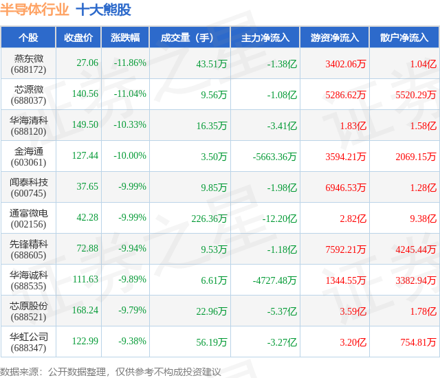 个股表现方面,半导体行业当日领跌股为燕东微(688172),该股当日报收27.06,下跌11.86%,成交量43.51万,主力资金净流出1.38亿元。芯源微(688037)以下跌11.04%紧随其后,该股当日成交量9.56万,主力资金净流出1.08亿元。除此之外,华海清科(688120)、金海通(603061)、闻泰科技(600745)均进入当日熊股之列。具体个股列表见下表: