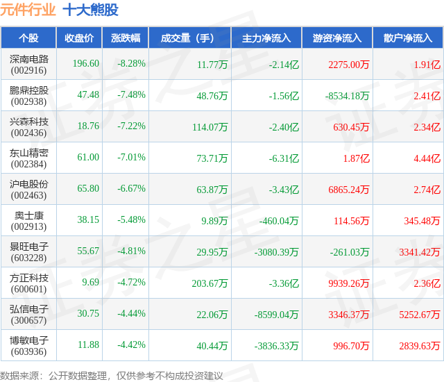 个股表现方面,元件行业当日领跌股为深南电路(002916),该股当日报收196.6,下跌8.28%,成交量11.77万,主力资金净流出2.14亿元。鹏鼎控股(002938)以下跌7.48%紧随其后,该股当日成交量48.76万,主力资金净流出1.56亿元。除此之外,兴森科技(002436)、东山精密(002384)、沪电股份(002463)均进入当日熊股之列。具体个股列表见下表: