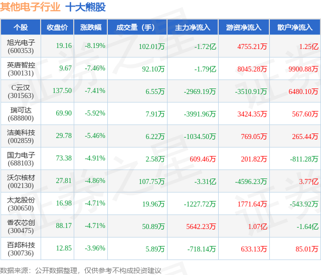 个股表现方面,其他电子行业当日领跌股为旭光电子(600353),该股当日报收19.16,下跌8.19%,成交量102.01万,主力资金净流出1.72亿元。英唐智控(300131)以下跌7.46%紧随其后,该股当日成交量92.1万,主力资金净流出1.79亿元。除此之外,C云汉(301563)、瑞可达(688800)、洁美科技(002859)均进入当日熊股之列。具体个股列表见下表: