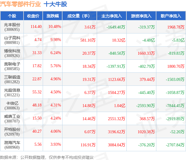 个股表现方面,汽车零部件行业当日领涨股为兆丰股份(300695),该股当日报收114.4,上涨10.48%,成交量3.61万,主力资金净流出1649.4万元。山子高科(000981)以上涨9.98%紧随其后,该股当日成交量581.1万,主力资金净流入10.32亿元。除此之外,博俊科技(300926)、奥联电子(300585)、三联锻造(001282)均进入当日牛股之列。具体个股列表见下表: