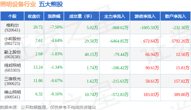 个股表现方面,照明设备行业当日领跌股为格利尔(920641),该股当日报收20.72,下跌7.5%,成交量5.02万,主力资金净流出968.62万元。小崧股份(002723)以下跌4.64%紧随其后,该股当日成交量29.5万,主力资金净流出6464.85万元。除此之外,勤上股份(002638)、得邦照明(603303)、三雄极光(300625)均进入当日熊股之列。具体个股列表见下表: