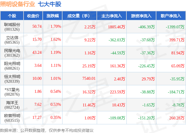 个股表现方面,照明设备行业当日领涨股为联域股份(001326),该股当日报收50.74,上涨1.7%,成交量2.25万,主力资金净流入1805.46万元。立达信(605365)以上涨1.62%紧随其后,该股当日成交量9.22万,主力资金净流出362.03万元。除此之外,民爆光电(301362)、阳光照明(600261)、恒太照明(920339)均进入当日牛股之列。具体个股列表见下表: