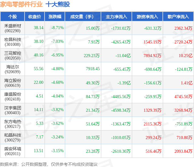 个股表现方面,家电零部件行业当日领跌股为禾盛新材(002290),该股当日报收38.14,下跌8.71%,成交量15.0万,主力资金净流出1731.02万元。宏昌科技(301008)以下跌7.03%紧随其后,该股当日成交量7.93万,主力资金净流出4265.43万元。除此之外,三花智控(002050)、海达尔(920699)、海立股份(600619)均进入当日熊股之列。具体个股列表见下表:
