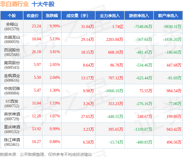 个股表现方面,非白酒行业当日领涨股为会稽山(601579),该股当日报收23.24,上涨9.99%,成交量31.04万,主力资金净流入1.74亿元。古越龙山(600059)以上涨5.13%紧随其后,该股当日成交量29.14万,主力资金净流入2203.84万元。除此之外,百润股份(002568)、莫高股份(600543)、金枫酒业(600616)均进入当日牛股之列。具体个股列表见下表: