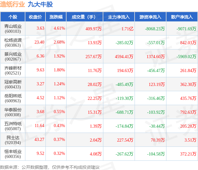 个股表现方面,造纸行业当日领涨股为青山纸业(600103),该股当日报收3.63,上涨4.61%,成交量409.97万,主力资金净流入1.71亿元。松炀资源(603863)以上涨2.68%紧随其后,该股当日成交量13.93万,主力资金净流出285.02万元。除此之外,景兴纸业(002067)、齐峰新材(002521)、冠豪高新(600433)均进入当日牛股之列。具体个股列表见下表: