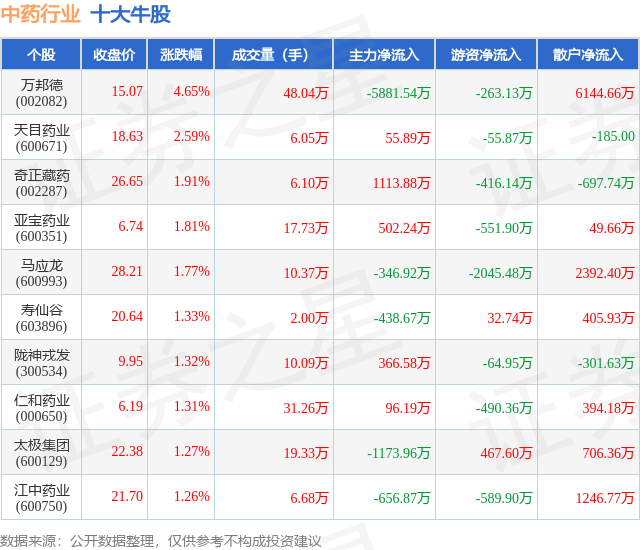 个股表现方面,中药行业当日领涨股为万邦德(002082),该股当日报收15.07,上涨4.65%,成交量48.04万,主力资金净流出5881.54万元。天目药业(600671)以上涨2.59%紧随其后,该股当日成交量6.05万,主力资金净流入55.89万元。除此之外,奇正藏药(002287)、亚宝药业(600351)、马应龙(600993)均进入当日牛股之列。具体个股列表见下表: