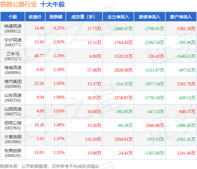 个股表现方面,铁路公路行业当日领涨股为皖通高速(600012),该股当日报收14.48,上涨4.25%,成交量17.75万,主力资金净流出2680.47万元。宁沪高速(600377)以上涨2.92%紧随其后,该股当日成交量15.11万,主力资金净流入1764.43万元。除此之外,三羊马(001317)、海南高速(000886)、海汽集团(603069)均进入当日牛股之列。具体个股列表见下表: