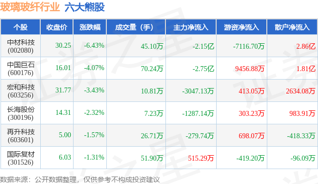个股表现方面,玻璃玻纤行业当日领跌股为中材科技(002080),该股当日报收30.25,下跌6.43%,成交量45.1万,主力资金净流出2.15亿元。中国巨石(600176)以下跌4.07%紧随其后,该股当日成交量70.24万,主力资金净流出2.75亿元。除此之外,宏和科技(603256)、长海股份(300196)、再升科技(603601)均进入当日熊股之列。具体个股列表见下表: