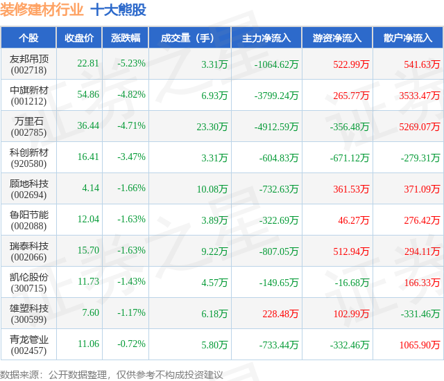个股表现方面,装修建材行业当日领跌股为友邦吊顶(002718),该股当日报收22.81,下跌5.23%,成交量3.31万,主力资金净流出1064.62万元。中旗新材(001212)以下跌4.82%紧随其后,该股当日成交量6.93万,主力资金净流出3799.24万元。除此之外,万里石(002785)、科创新材(920580)、顾地科技(002694)均进入当日熊股之列。具体个股列表见下表: