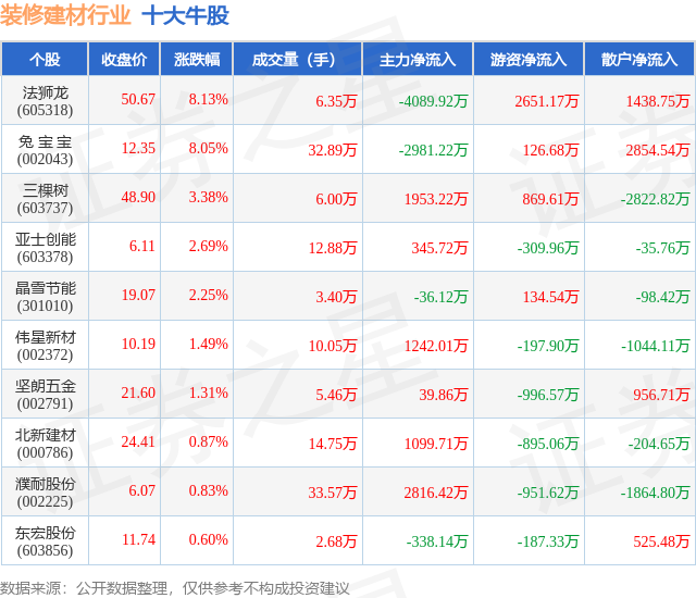 个股表现方面,装修建材行业当日领涨股为法狮龙(605318),该股当日报收50.67,上涨8.13%,成交量6.35万,主力资金净流出4089.92万元。兔 宝 宝(002043)以上涨8.05%紧随其后,该股当日成交量32.89万,主力资金净流出2981.22万元。除此之外,三棵树(603737)、亚士创能(603378)、晶雪节能(301010)均进入当日牛股之列。具体个股列表见下表: