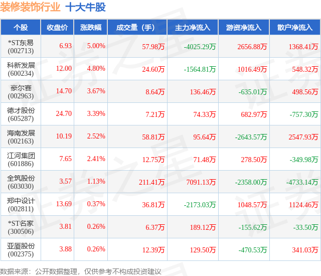 个股表现方面,装修装饰行业当日领涨股为*ST东易(002713),该股当日报收6.93,上涨5.0%,成交量57.98万,主力资金净流出4025.29万元。科新发展(600234)以上涨4.8%紧随其后,该股当日成交量24.6万,主力资金净流出1564.81万元。除此之外,豪尔赛(002963)、德才股份(605287)、海南发展(002163)均进入当日牛股之列。具体个股列表见下表: