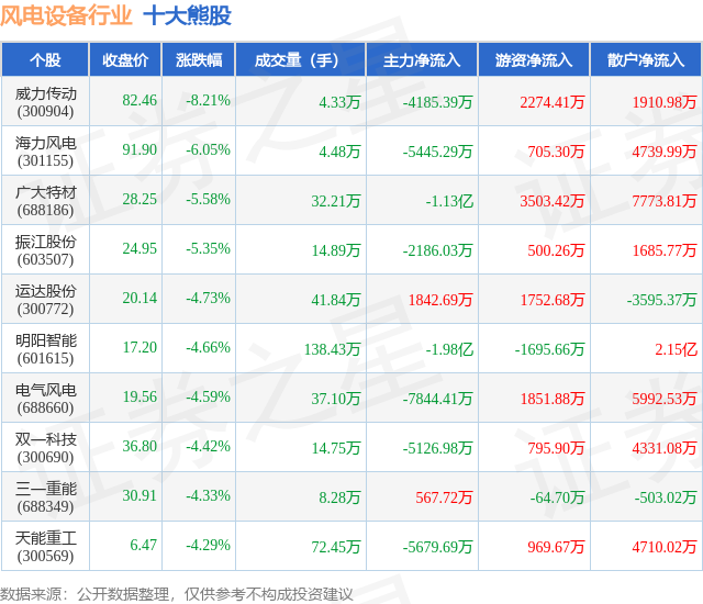 个股表现方面,风电设备行业当日领跌股为威力传动(300904),该股当日报收82.46,下跌8.21%,成交量4.33万,主力资金净流出4185.39万元。海力风电(301155)以下跌6.05%紧随其后,该股当日成交量4.48万,主力资金净流出5445.29万元。除此之外,广大特材(688186)、振江股份(603507)、运达股份(300772)均进入当日熊股之列。具体个股列表见下表: