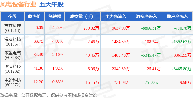 个股表现方面,风电设备行业当日领涨股为吉鑫科技(601218),该股当日报收6.39,上涨4.24%,成交量269.02万,主力资金净流入9637.09万元。常友科技(301557)以上涨4.07%紧随其后,该股当日成交量2.46万,主力资金净流入1484.39万元。除此之外,禾望电气(603063)、飞沃科技(301232)、中船科技(600072)均进入当日牛股之列。具体个股列表见下表: