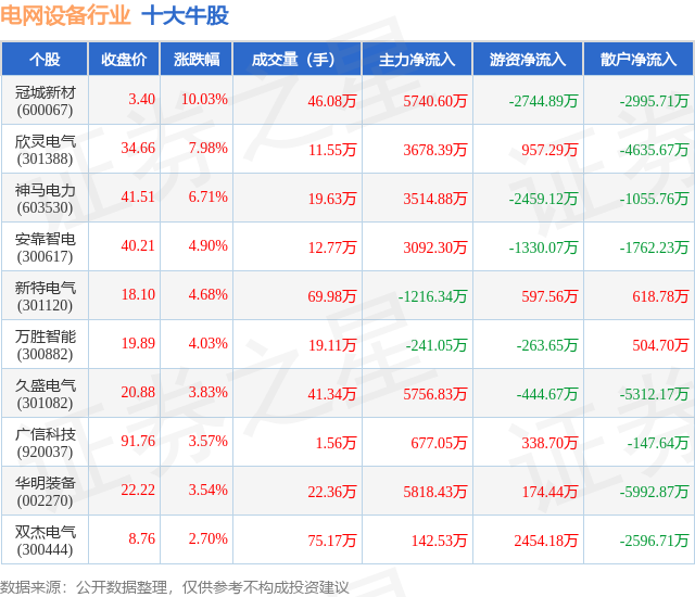 个股表现方面,电网设备行业当日领涨股为冠城新材(600067),该股当日报收3.4,上涨10.03%,成交量46.08万,主力资金净流入5740.6万元。欣灵电气(301388)以上涨7.98%紧随其后,该股当日成交量11.55万,主力资金净流入3678.39万元。除此之外,神马电力(603530)、安靠智电(300617)、新特电气(301120)均进入当日牛股之列。具体个股列表见下表: