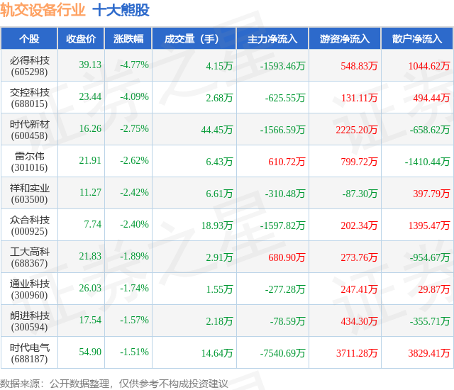 个股表现方面,轨交设备行业当日领跌股为必得科技(605298),该股当日报收39.13,下跌4.77%,成交量4.15万,主力资金净流出1593.46万元。交控科技(688015)以下跌4.09%紧随其后,该股当日成交量2.68万,主力资金净流出625.55万元。除此之外,时代新材(600458)、雷尔伟(301016)、祥和实业(603500)均进入当日熊股之列。具体个股列表见下表: