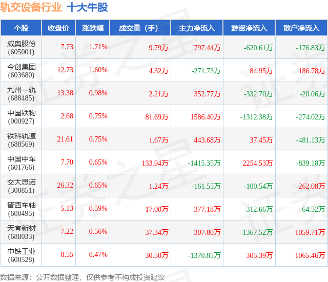 个股表现方面,轨交设备行业当日领涨股为威奥股份(605001),该股当日报收7.73,上涨1.71%,成交量9.79万,主力资金净流入797.44万元。今创集团(603680)以上涨1.6%紧随其后,该股当日成交量4.32万,主力资金净流出271.73万元。除此之外,九州一轨(688485)、中国铁物(000927)、铁科轨道(688569)均进入当日牛股之列。具体个股列表见下表: