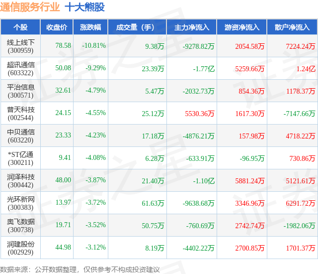 个股表现方面,通信服务行业当日领跌股为线上线下(300959),该股当日报收78.58,下跌10.81%,成交量9.38万,主力资金净流出9278.82万元。超讯通信(603322)以下跌9.29%紧随其后,该股当日成交量23.39万,主力资金净流出1.77亿元。除此之外,平治信息(300571)、普天科技(002544)、中贝通信(603220)均进入当日熊股之列。具体个股列表见下表: