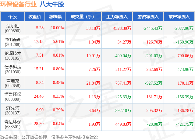 个股表现方面,环保设备行业当日领涨股为法尔胜(000890),该股当日报收5.28,上涨10.0%,成交量33.18万,主力资金净流入4523.39万元。*ST清研(301288)以上涨5.61%紧随其后,该股当日成交量1.04万,主力资金净流入34.27万元。除此之外,龙源技术(300105)、仕净科技(301030)、雪迪龙(002658)均进入当日牛股之列。具体个股列表见下表: