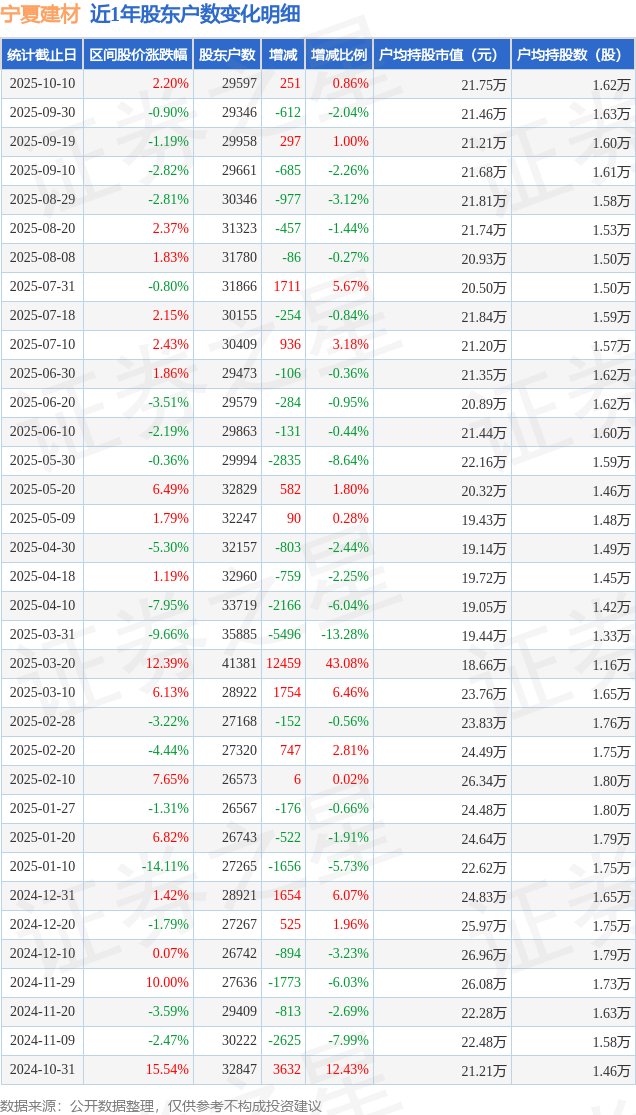 从股价来看,2025年9月19日至2025年10月10日,宁夏建材区间涨幅为1.28%,在此期间股东户数减少361.0户,减幅为1.21%。