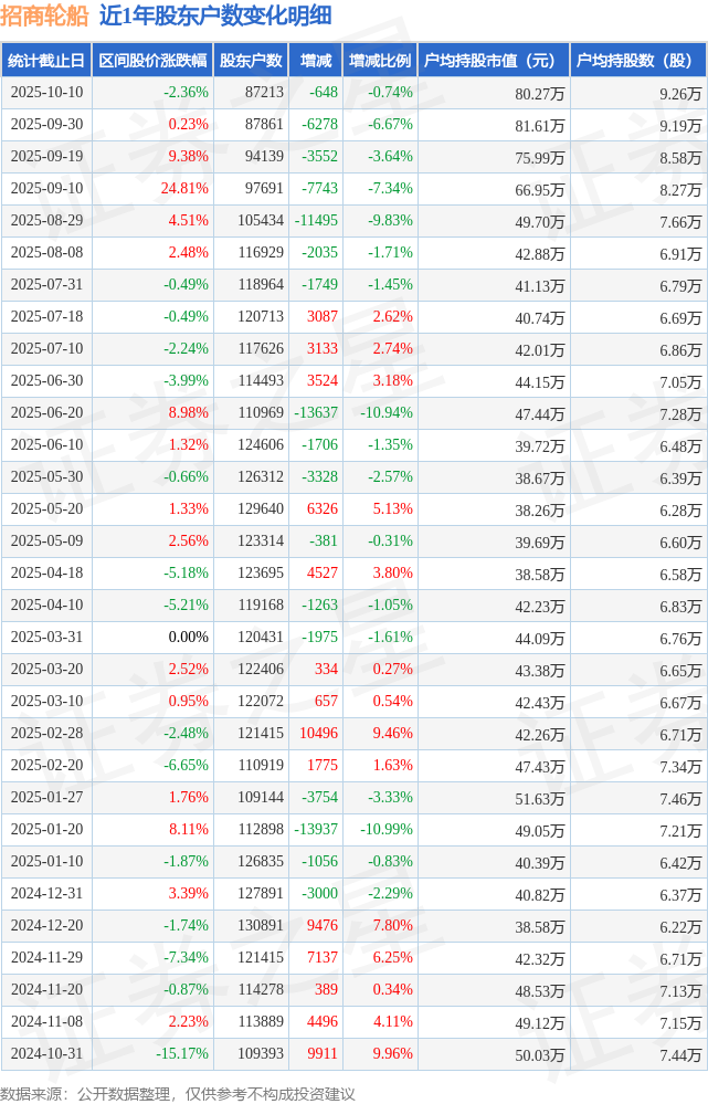 从股价来看,2025年9月30日至2025年10月10日,招商轮船区间跌幅为2.36%,在此期间股东户数减少648.0户,减幅为0.74%。
