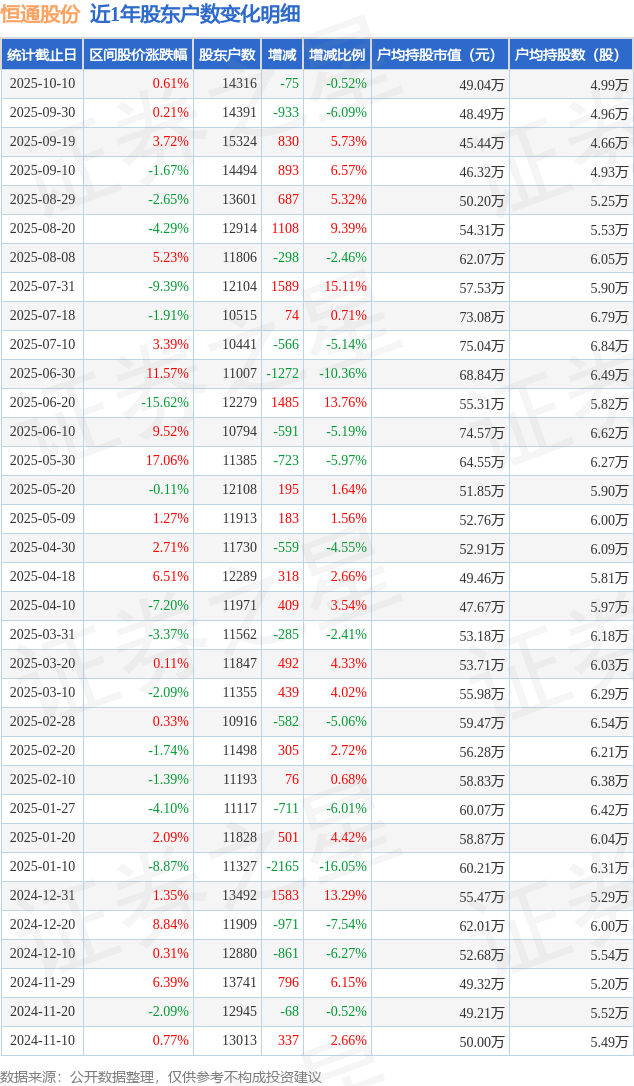从股价来看,2025年9月30日至2025年10月10日,恒通股份区间涨幅为0.61%,在此期间股东户数减少75.0户,减幅为0.52%。