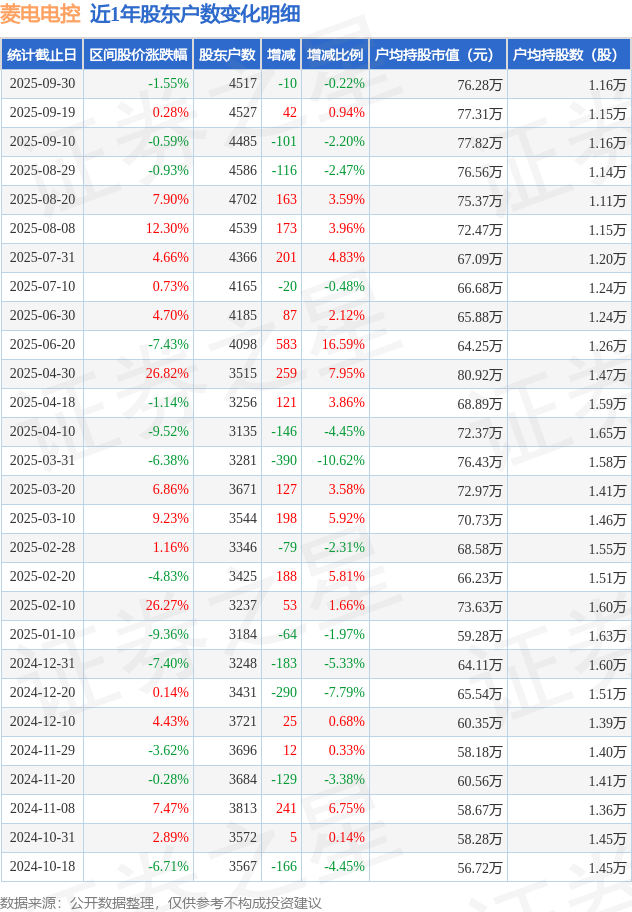 从股价来看,2025年9月19日至2025年9月30日,菱电电控区间跌幅为1.55%,在此期间股东户数减少10.0户,减幅为0.22%。