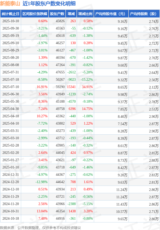 从股价来看,2025年9月30日至2025年10月10日,新能泰山区间涨幅为0.6%,在此期间股东户数增加263.0户,增幅为0.58%。