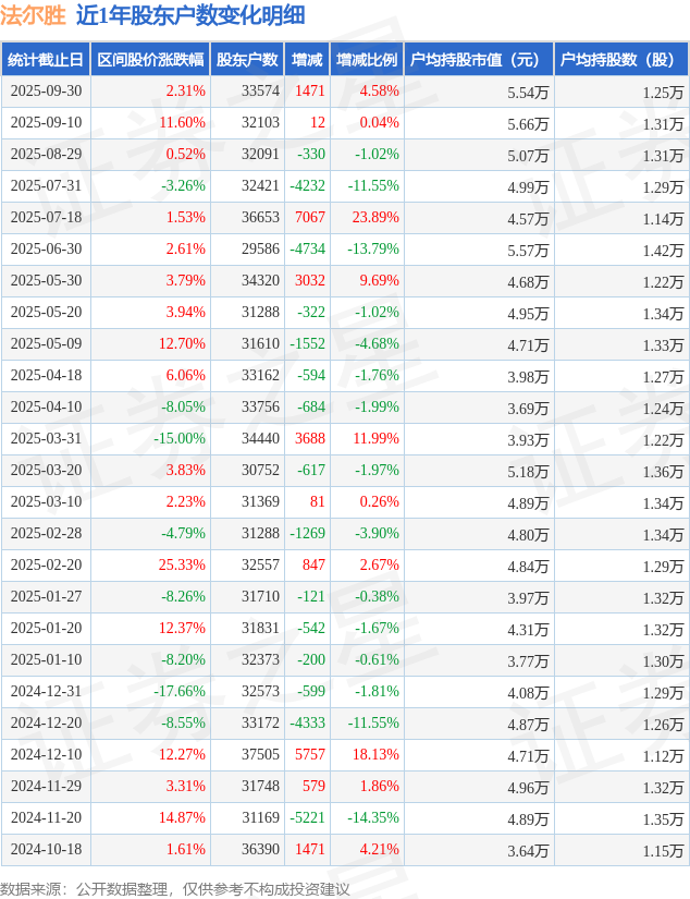 从股价来看,2025年9月10日至2025年9月30日,法尔胜区间涨幅为2.31%,在此期间股东户数增加1471.0户,增幅为4.58%。