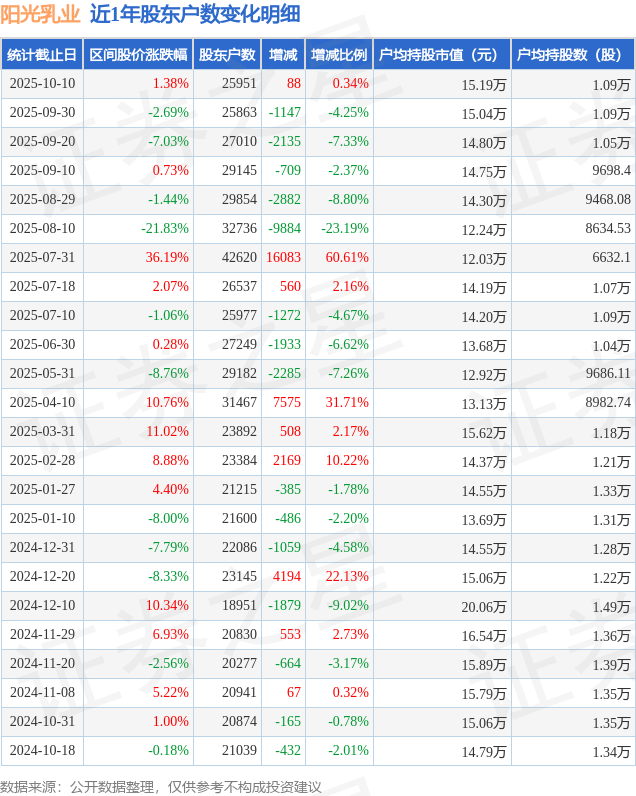 从股价来看,2025年9月30日至2025年10月10日,阳光乳业区间涨幅为1.38%,在此期间股东户数增加88.0户,增幅为0.34%。