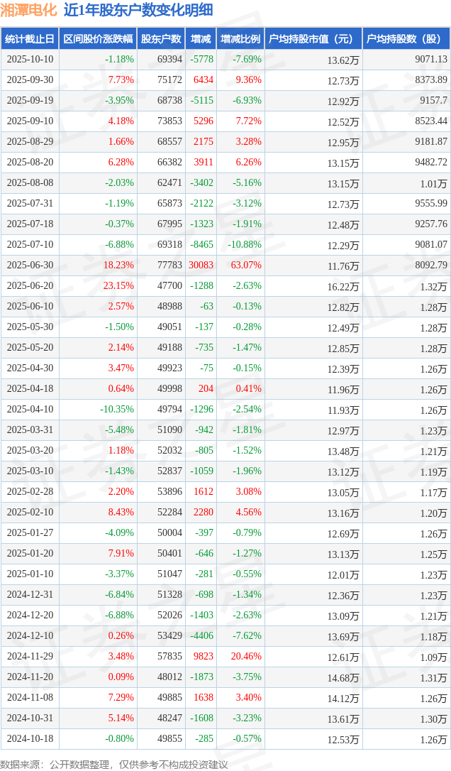 从股价来看,2025年9月30日至2025年10月10日,湘潭电化区间跌幅为1.18%,在此期间股东户数减少5778.0户,减幅为7.69%。