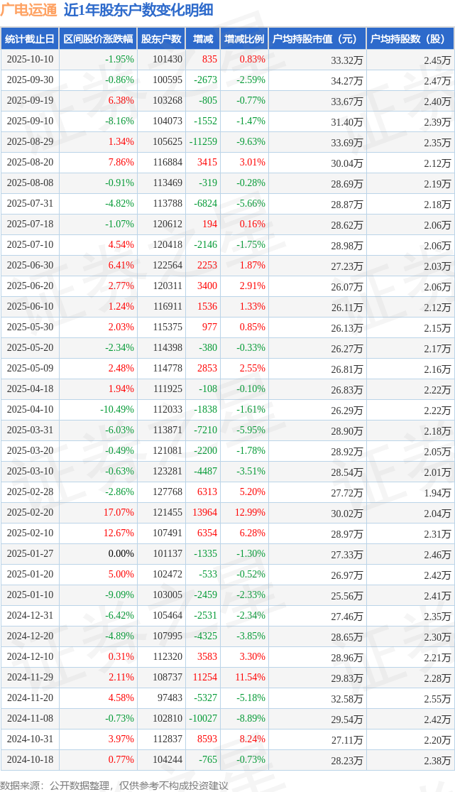 从股价来看,2025年9月30日至2025年10月10日,广电运通区间跌幅为1.95%,在此期间股东户数增加835.0户,增幅为0.83%。