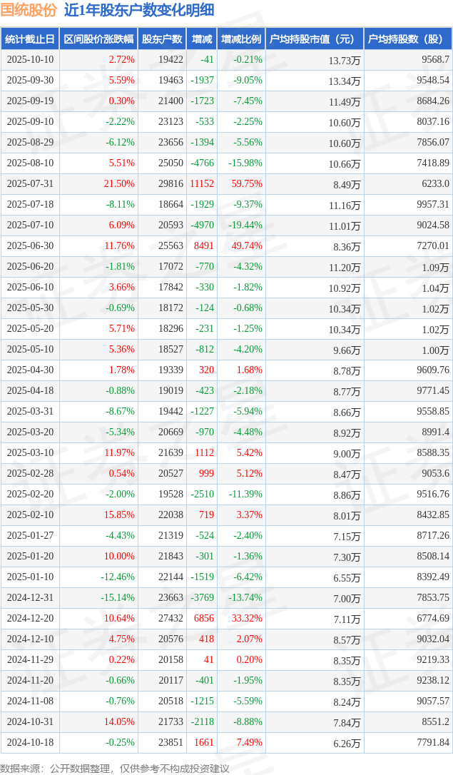 从股价来看,2025年9月30日至2025年10月10日,国统股份区间涨幅为2.72%,在此期间股东户数减少41.0户,减幅为0.21%。
