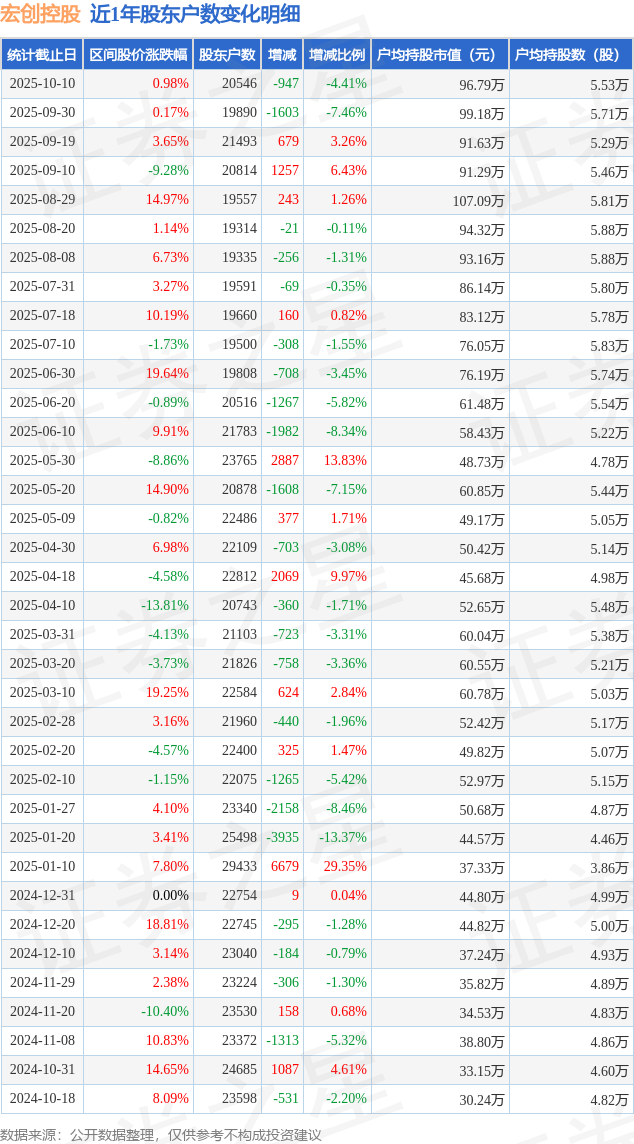 从股价来看,2025年9月19日至2025年10月10日,宏创控股区间涨幅为0.98%,在此期间股东户数减少947.0户,减幅为4.41%。