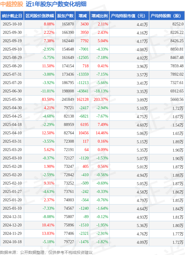 从股价来看,2025年9月19日至2025年10月10日,中超控股区间涨幅为8.08%,在此期间股东户数增加3430.0户,增幅为2.11%。