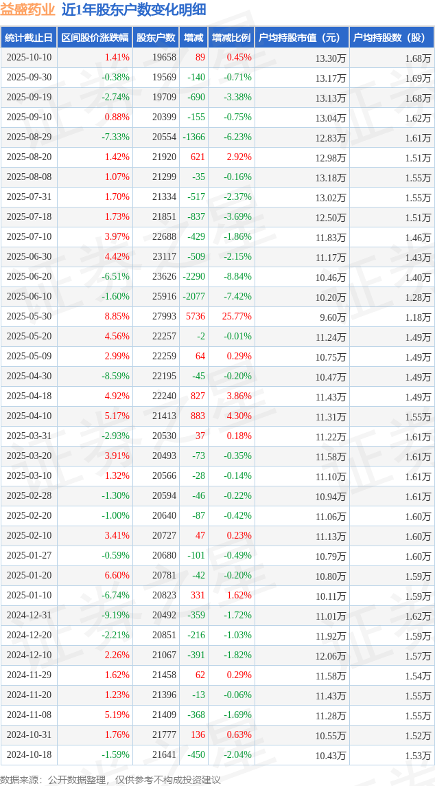 从股价来看,2025年9月30日至2025年10月10日,益盛药业区间涨幅为1.41%,在此期间股东户数增加89.0户,增幅为0.45%。