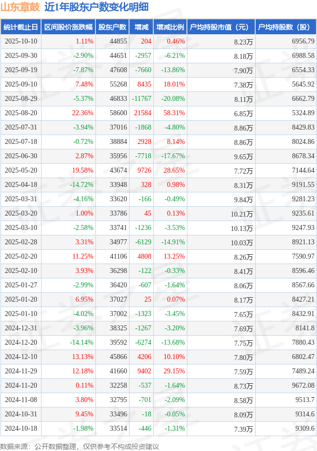 从股价来看,2025年9月30日至2025年10月10日,山东章鼓区间涨幅为1.11%,在此期间股东户数增加204.0户,增幅为0.46%。