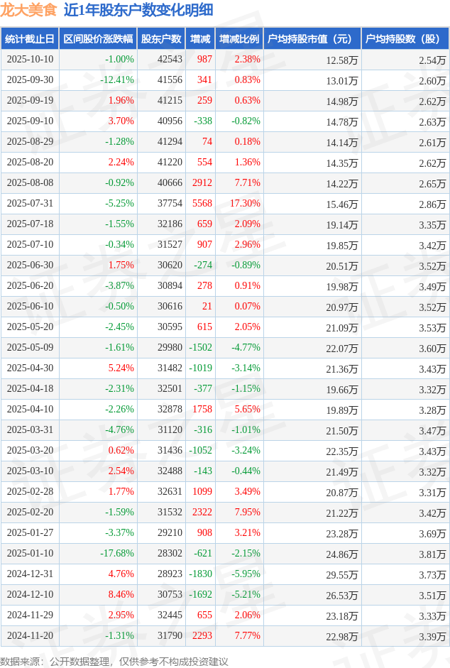 从股价来看,2025年9月30日至2025年10月10日,龙大美食区间跌幅为1.0%,在此期间股东户数增加987.0户,增幅为2.38%。