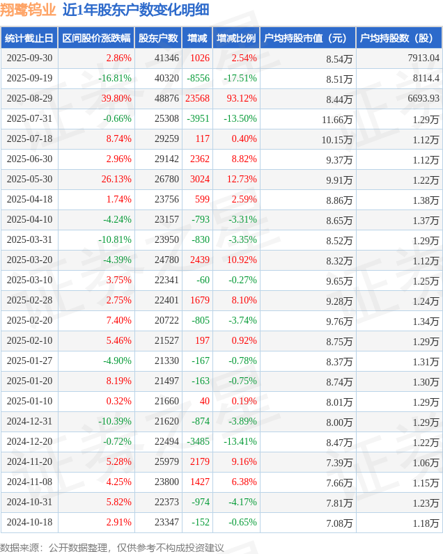 从股价来看,2025年9月19日至2025年9月30日,翔鹭钨业区间涨幅为2.86%,在此期间股东户数增加1026.0户,增幅为2.54%。
