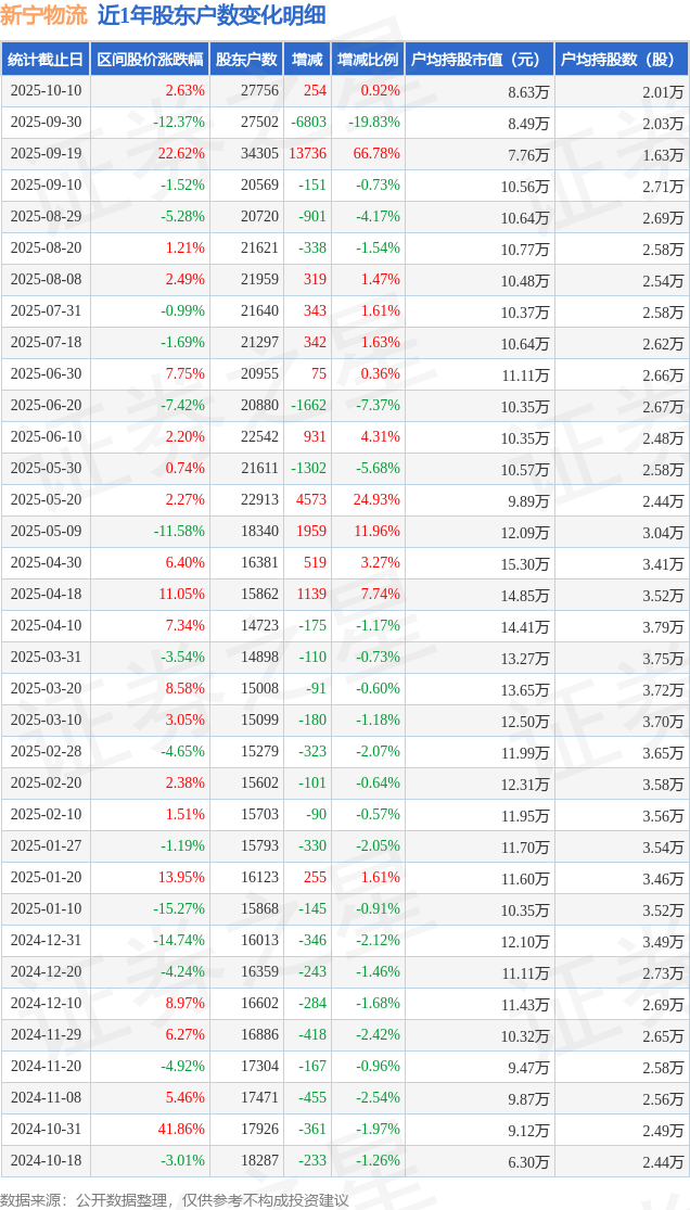 从股价来看,2025年9月30日至2025年10月10日,新宁物流区间涨幅为2.63%,在此期间股东户数增加254.0户,增幅为0.92%。