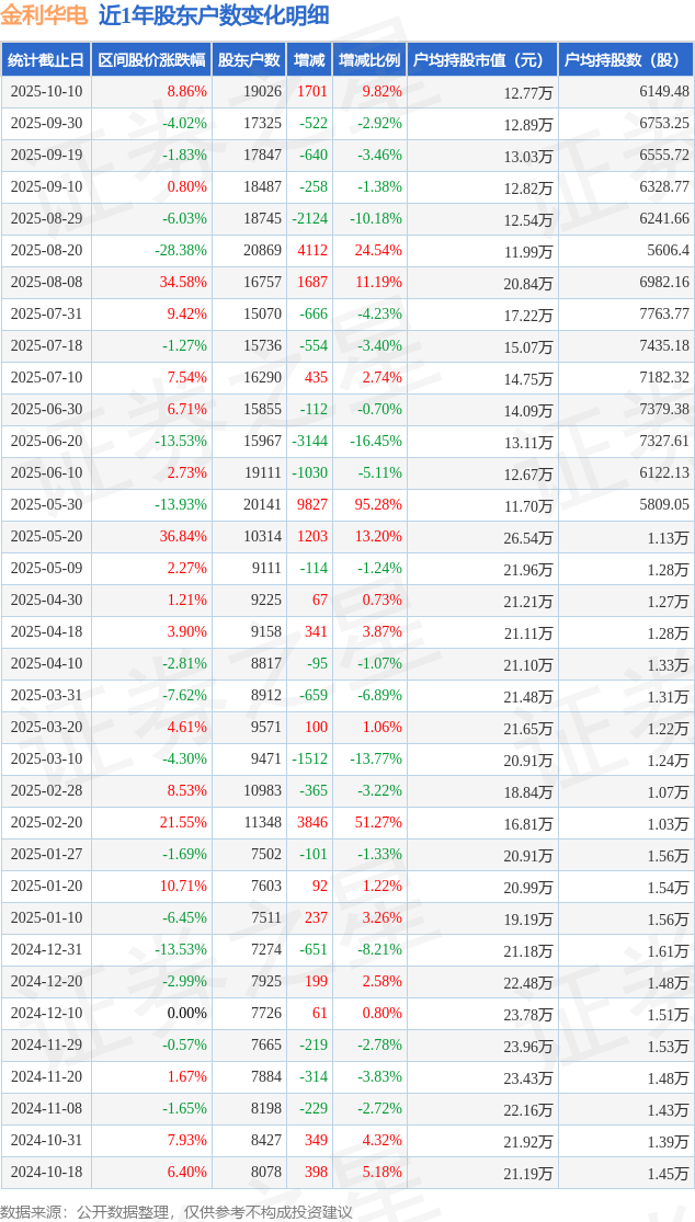 从股价来看,2025年9月30日至2025年10月10日,金利华电区间涨幅为8.86%,在此期间股东户数增加1701.0户,增幅为9.82%。