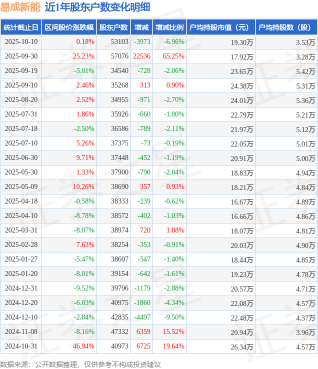 从股价来看,2025年9月30日至2025年10月10日,易成新能区间涨幅为0.18%,在此期间股东户数减少3973.0户,减幅为6.96%。