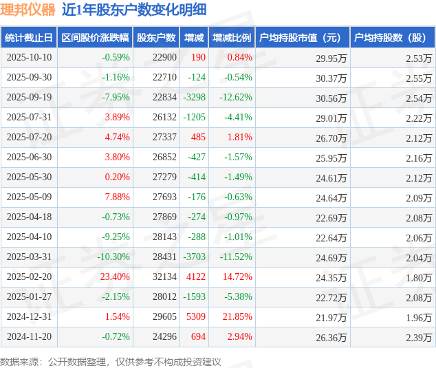 证券之星消息,近日理邦仪器披露,截至2025年10月10日公司股东户数为2.29万户,较7月31日减少3232.0户,减幅为12.37%。户均持股数量由上期的2.55万股减少至2.53万股,户均持股市值为29.95万元。