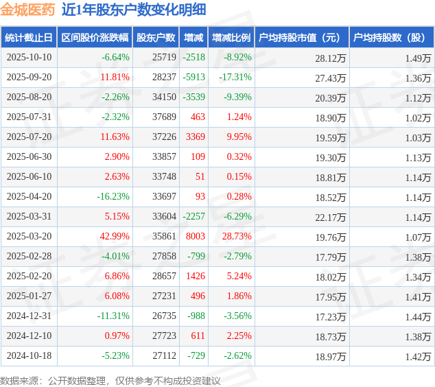 从股价来看,2025年9月20日至2025年10月10日,金城医药区间跌幅为6.64%,在此期间股东户数减少2518.0户,减幅为8.92%。