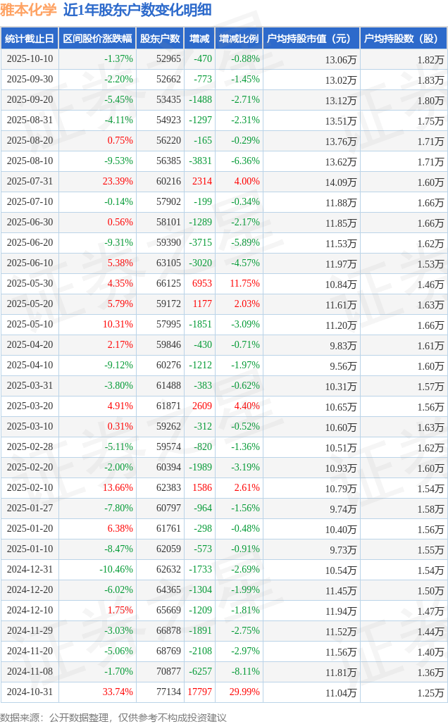 从股价来看,2025年9月20日至2025年10月10日,雅本化学区间跌幅为1.37%,在此期间股东户数减少470.0户,减幅为0.88%。