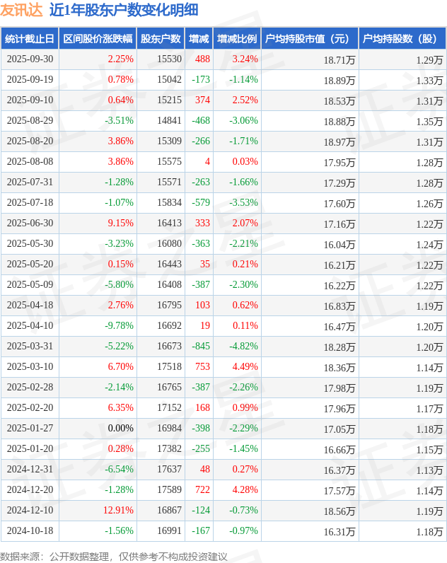 从股价来看,2025年9月19日至2025年9月30日,友讯达区间涨幅为2.25%,在此期间股东户数增加488.0户,增幅为3.24%。