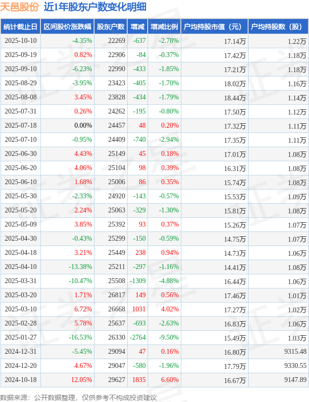 证券之星消息,近日天邑股份披露,截至2025年10月10日公司股东户数为2.23万户,较9月19日减少637.0户,减幅为2.78%。户均持股数量由上期的1.18万股增加至1.22万股,户均持股市值为17.14万元。