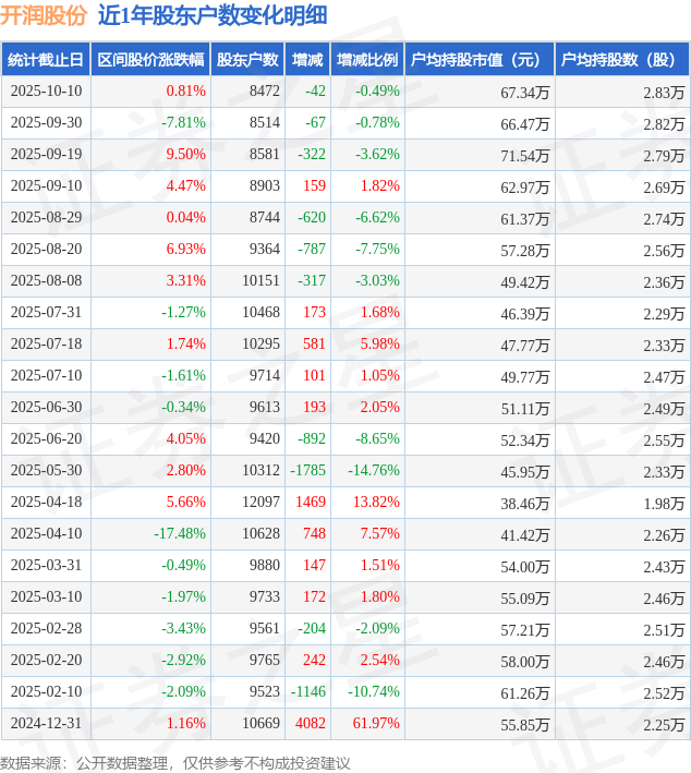从股价来看,2025年9月30日至2025年10月10日,开润股份区间涨幅为0.81%,在此期间股东户数减少42.0户,减幅为0.49%。